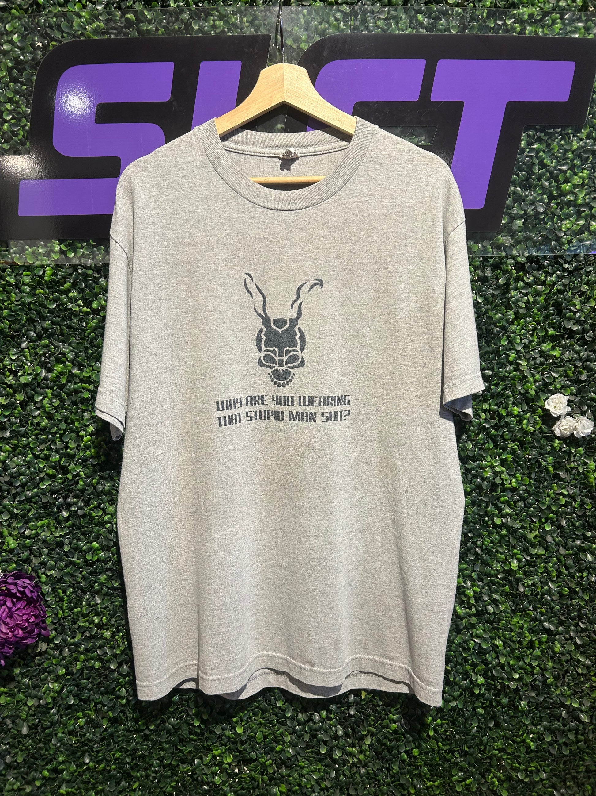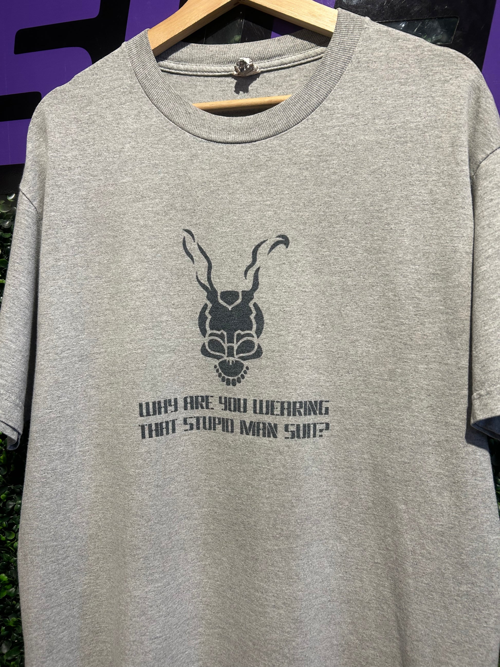00s Donnie Darko “Why Are You Wearing That Stupid Man Suit?” T-Shirt. Size Large