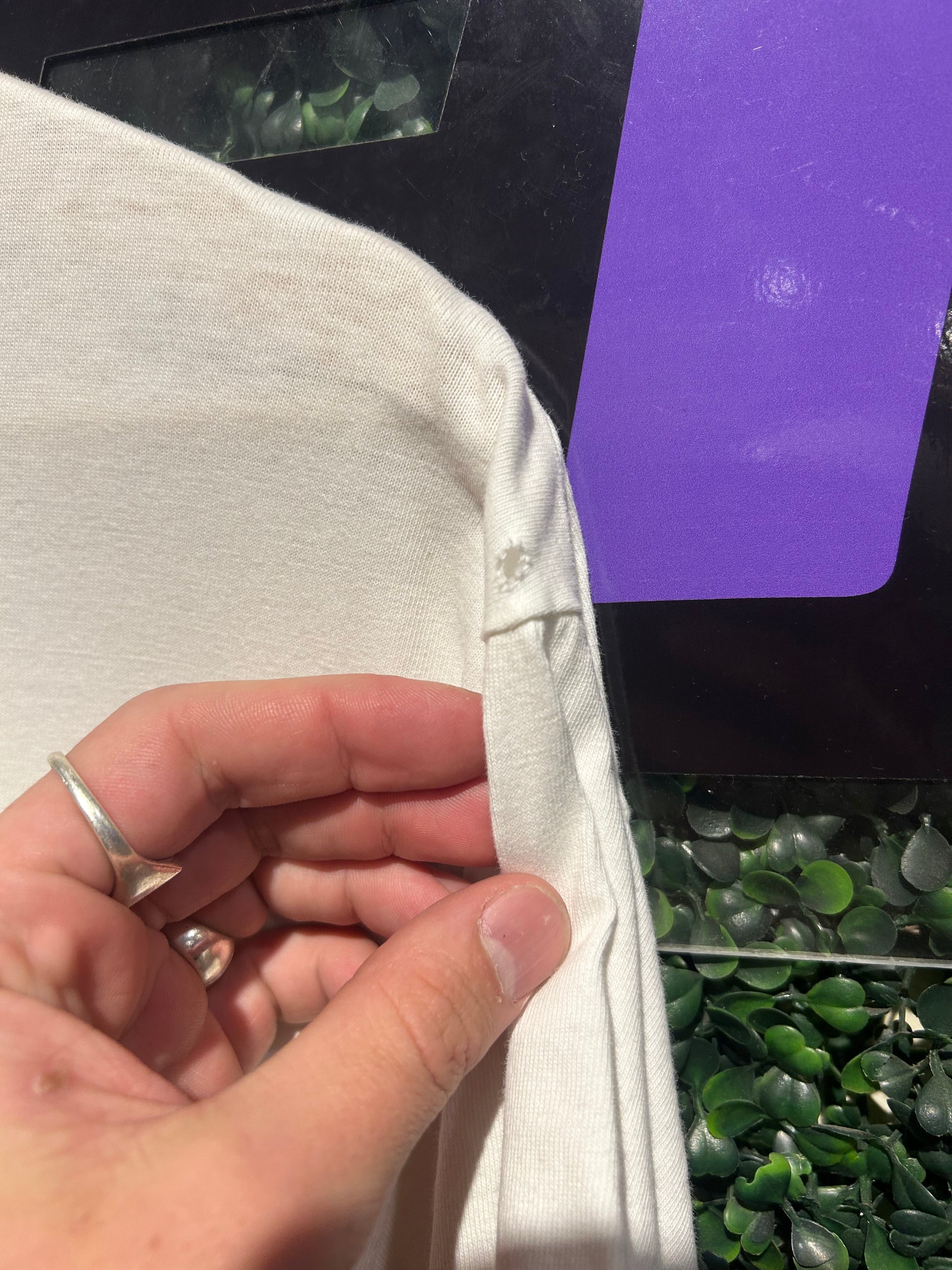 Light stain above graphic and small hole on shoulder